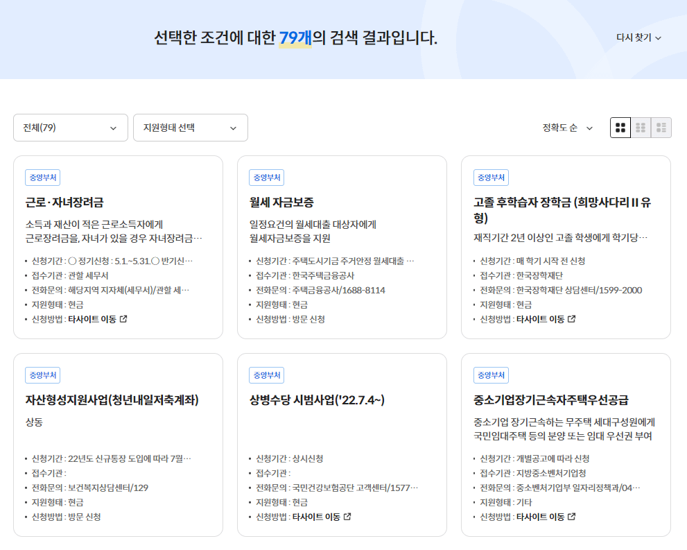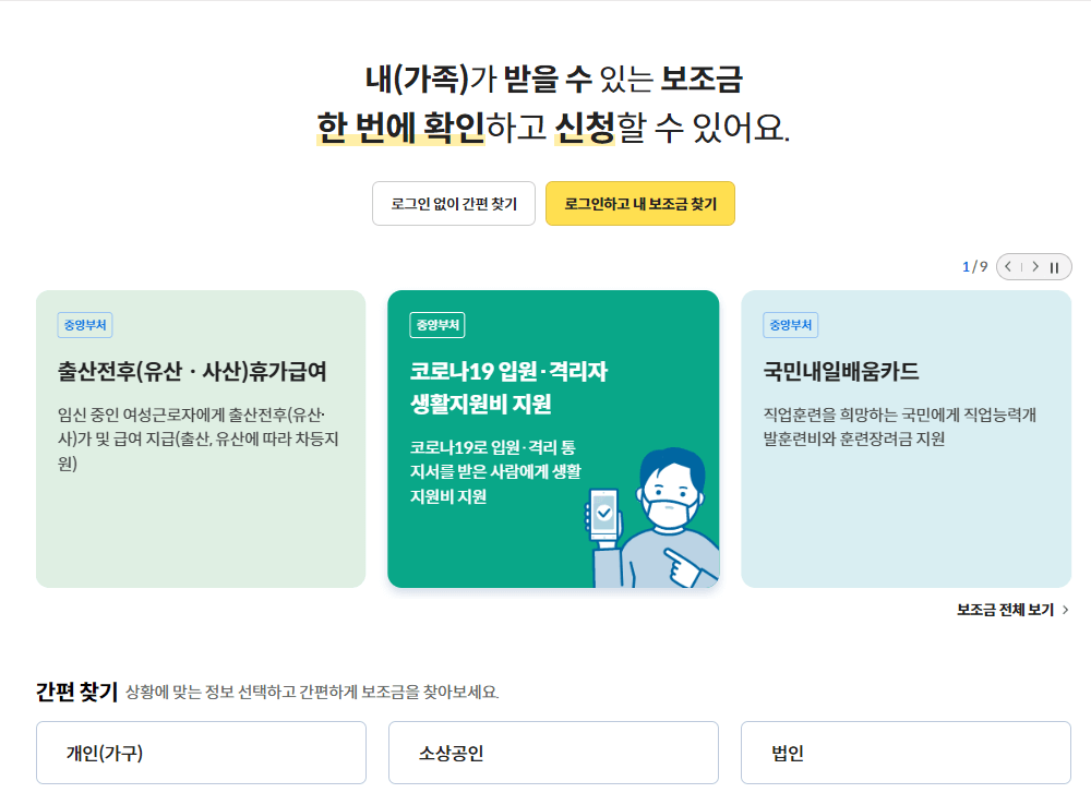 - 방문 신청 : 본인 신분증 지참 후, 보조금 24 신청서 제출 -> 가능한 정부지원금 목록 수령-> 확인 후, 신청