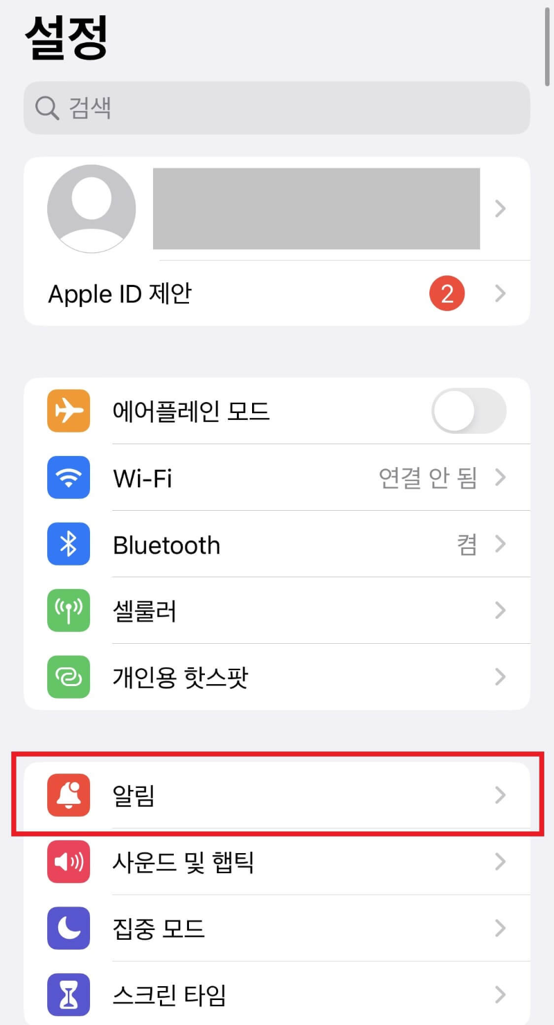 에어플레인 모드, Wifi, Bluetooth, 셀룰러, 개인용 핫스팟 아래를 보면 '알림'이 있는데, 클릭합니다.