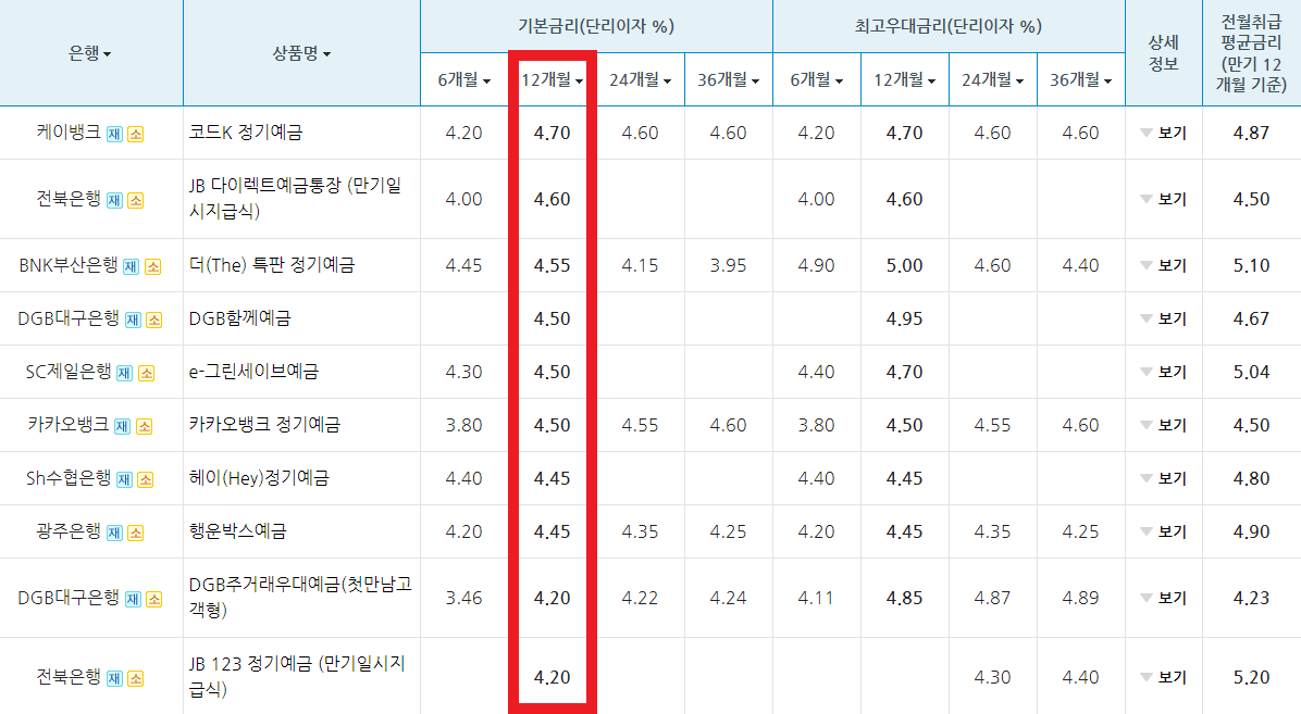 12개월을 기준으로 기본금리가 높은 순으로 나열해 보니, 케이뱅크, 전북은행, 부산은행, 대구은행, SC제일은행 순서였습니다. 다음으로 카카오뱅크, Sh수협은행, 광주은행 등의 상품들도 참고하시길 바랍니다.