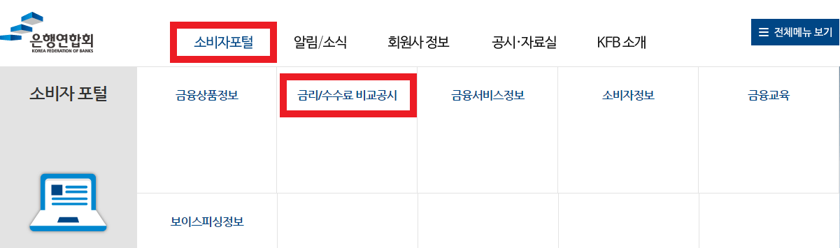 홈페이지 상단에 '소비자포털'의 '금리/수수료 비교공시'를 클릭합니다.