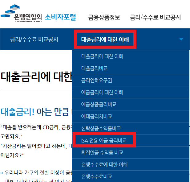 '금리에 대한 이해'의 'ISA 전용 예금 금리비교'를 누릅니다.