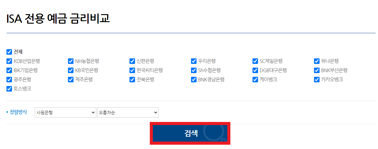 그러면 은행들이 뜨는데, '전체'를 선택하여 '검색'을 누릅니다. 정렬방식은 원하는 대로 세팅해주면 됩니다.